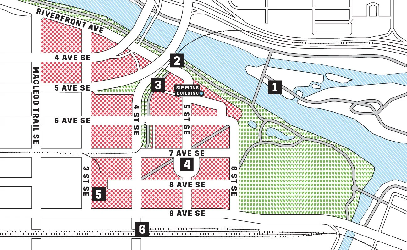 A stunning 34-metre long mural along Riverfront Lane made up of 950,000 mosaic tiles tells a visual story that unfolds in 5 accordion-angled sections, using a mix of images that narrate change in Calgary.